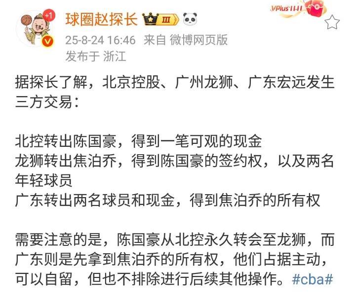 由于徐昕的申请离队,广东男篮参与了北控男篮主导的多方交易。据媒体人“球圈赵探长”透露,目前这笔多方交易的结果已经出炉:北控男篮送出陈国豪得到现金;广州男篮送出焦伯乔得到陈国豪的签约权,另外还有两名年轻球员;广东男篮送出两名年轻球员以及现金,得到了焦伯乔的签约权。从这笔交易本身来看,广东男篮和广州男篮都得到心仪的球员,北控男篮算是白忙活一场,并没有得到心仪的后卫王岚嵚。