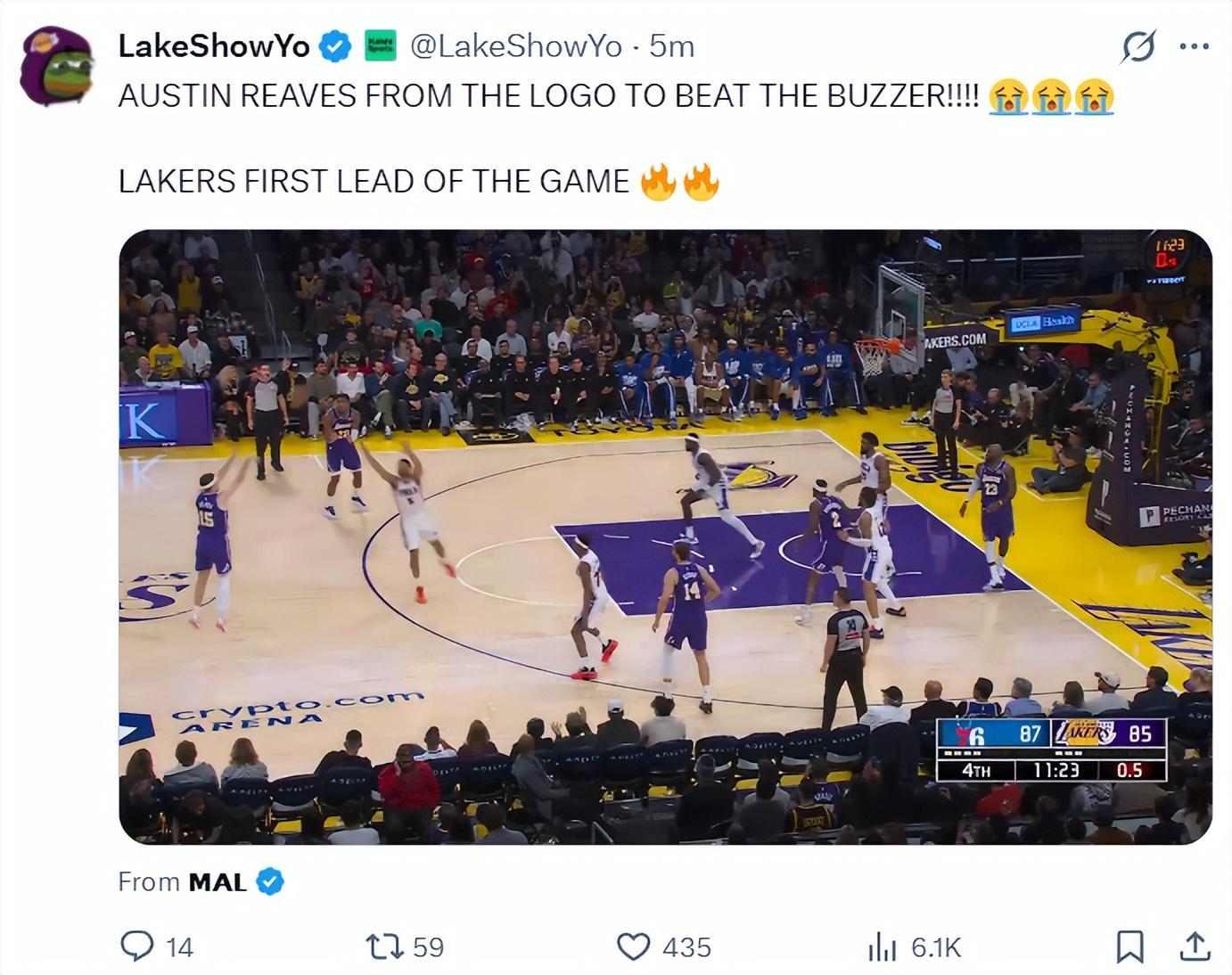 奥斯汀-里夫斯实在是太出色了,末节开场湖人还在落后,但在短短1分06秒的时间里里夫斯一人打出了8-0的攻势直接帮助湖人反超,湖人队记迈克-特鲁戴尔都觉得不可思议。